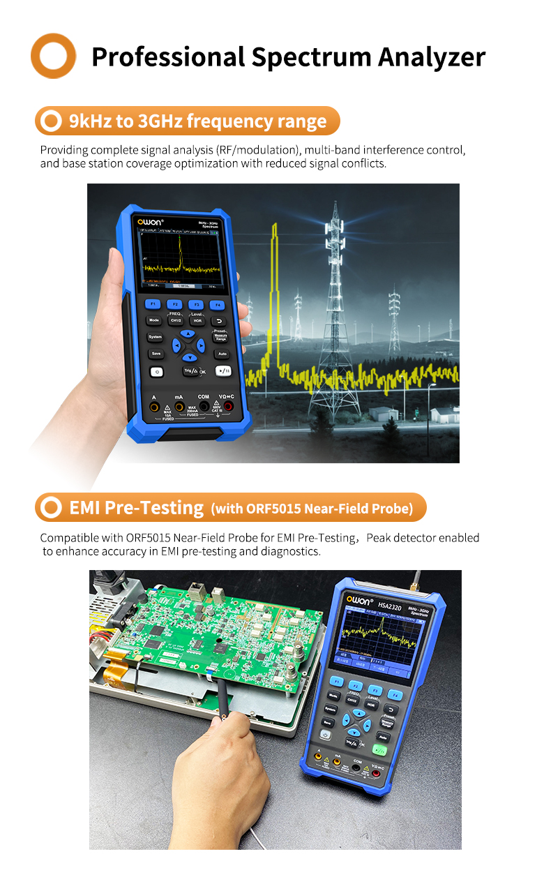+ Spectrum Analyzer: max.9kHz to 3GHz frequency range, 100Hz frequency resolution