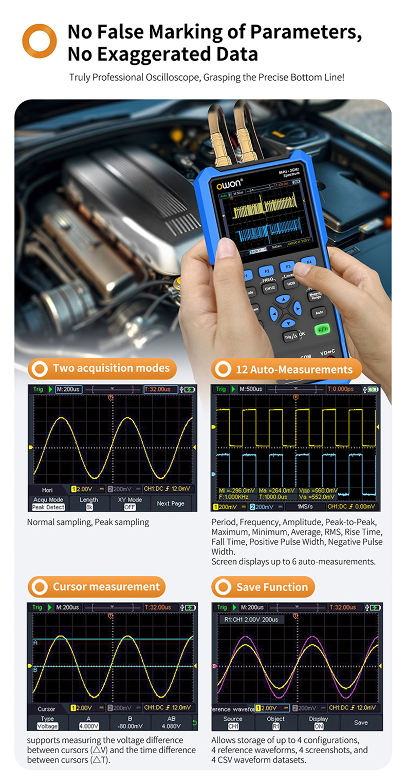 + Oscilloscope: 70MHz-200MHz bandwidth, 250MSa/s sampling rate, 8K memory depth